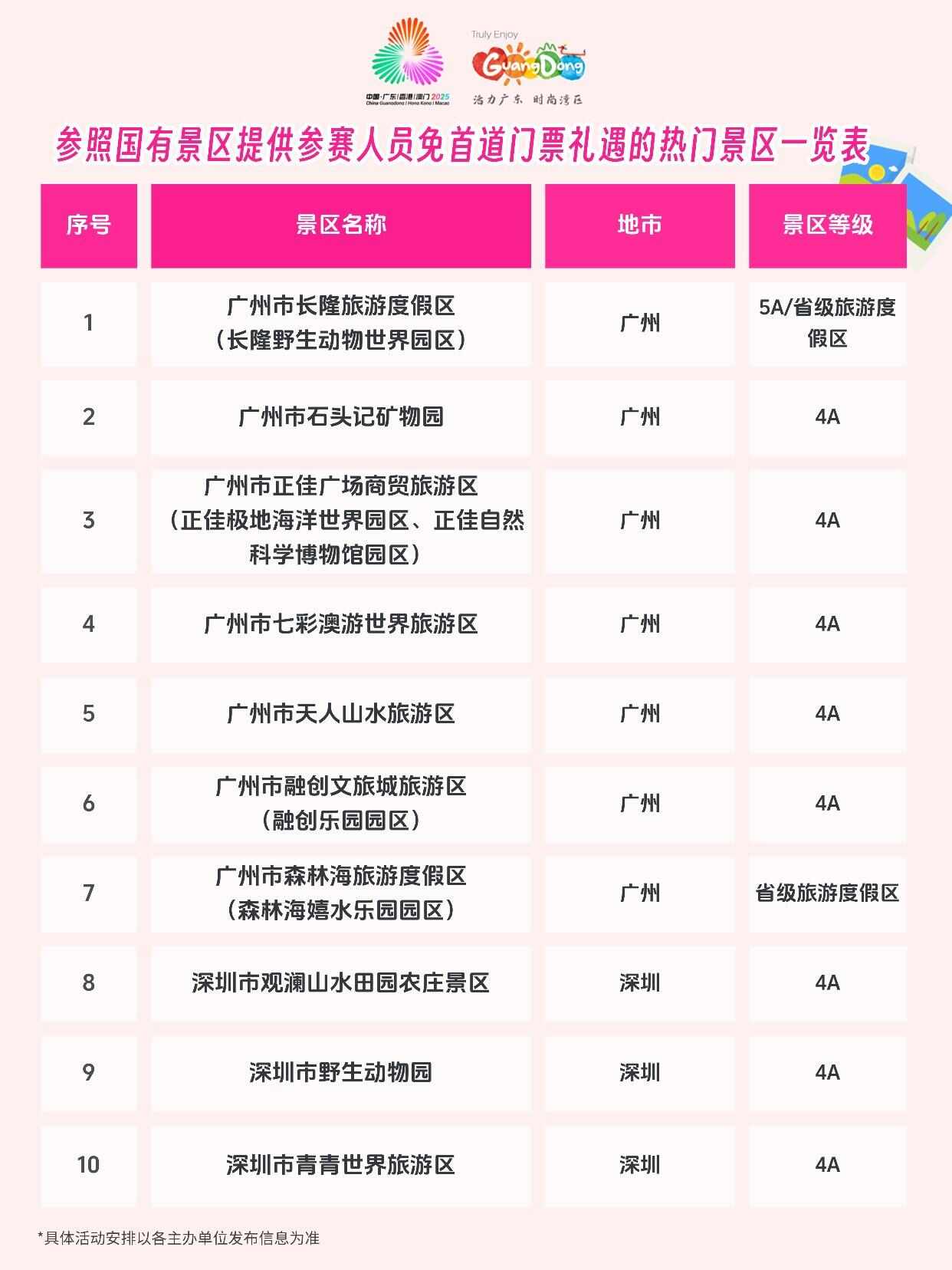 从广州长隆野生动物世界的奇趣探索、融创乐园的欢乐体验,到阳江海陵岛大角湾景区的碧波银滩、江门赤坎华侨古镇的侨乡风情,再到清远连州地下河的溶洞奇观、古龙峡旅游区的飞瀑激流,让参赛健儿在激烈赛事之余,能够漫步岭南山水,品味人文底蕴,在广东留下一段“赛时全力拼搏,赛后自在畅游”的难忘记忆。