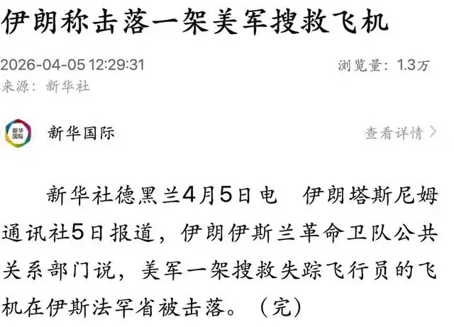 伊朗塔斯尼姆通讯社5日报道,伊朗伊斯兰革命卫队公共关系部门说,美军一架搜救失踪飞行员的飞机在伊斯法罕省被击落。